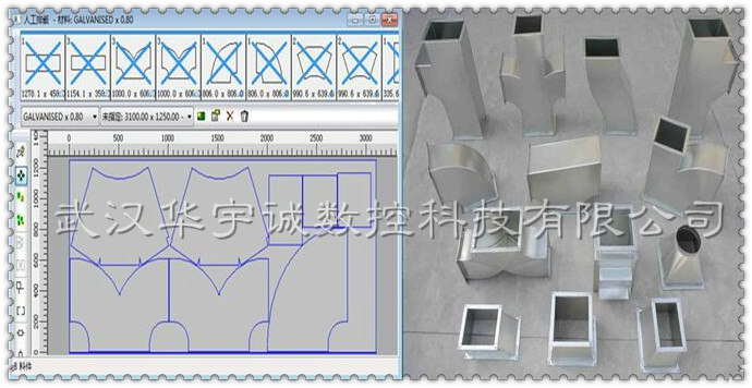 加工范围:0.2-6.0mm任意材料钢板的切割成型!可切割各种异形件,电脑直接画图,导出加工程序,批量高速切割,效果好,精度高,不挂渣!配合专用的风管展开软件,自动生成图纸、导出加工程序。操作人员所需要做的就是在软件中选择所需要的风管样式,输入所需要的尺寸,然后调出加工程序进行切割就可以了。既方便快捷、又精确实用。